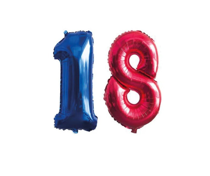 El set incluye un globo con forma de número 1 en azul y otro forma de número 8 en rojo con acabado metalizado y una medida de 70 cm, ideales para decoración 18 de septiembre.