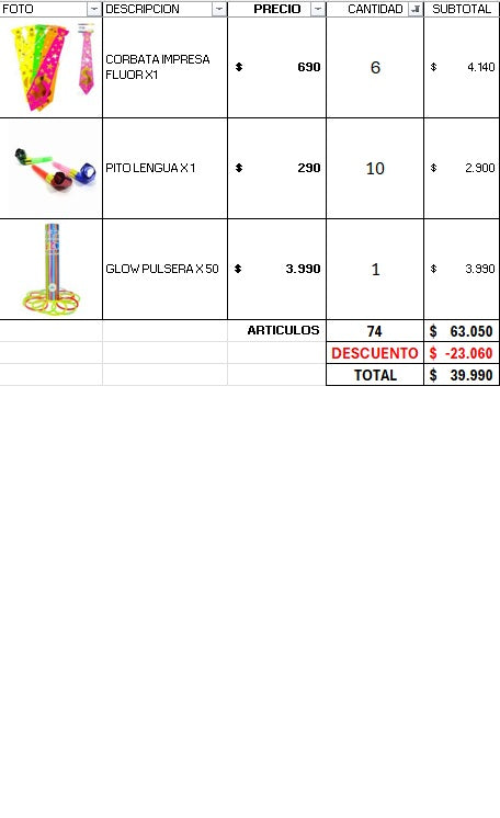 Pack cotillon fluor luminoso, para 25 invitados.