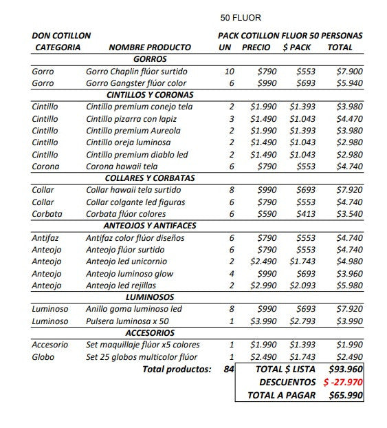 Pack 50 invitados cotillon flúor luminoso